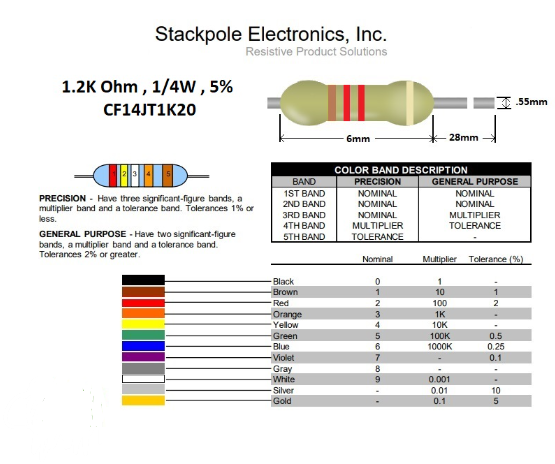رنگ های مقاومت 1.2 کیلو اهم 1/4 وات به ترتیب عبارتند از قهوه ای , قرمز , قرمز .